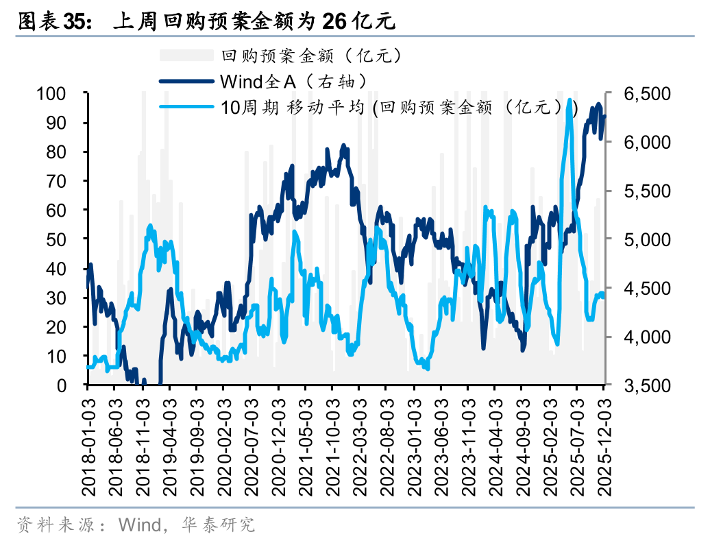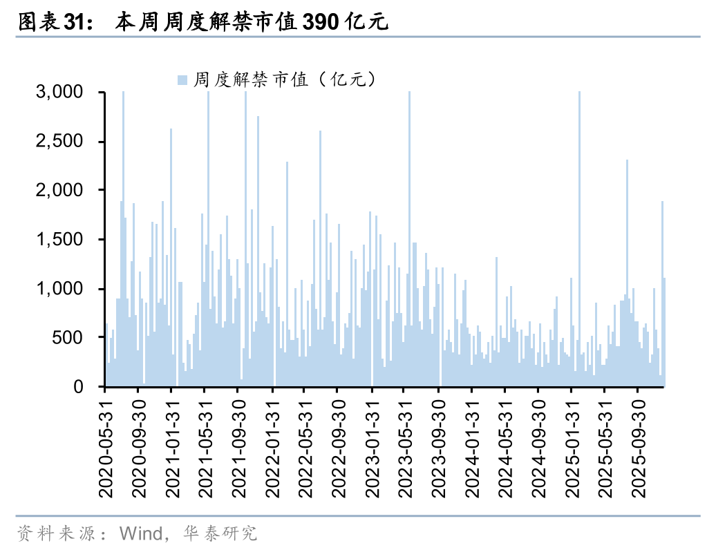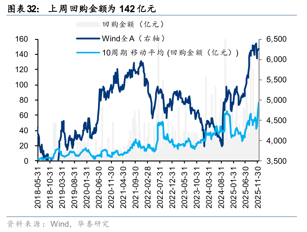 上周二级市场重要股东净减持89亿元。解禁市值方面,本周解禁市值为390亿元,供给端压力环比回落。回购方面,上周二级市场股票回购金额142亿元,回购预案金额为26亿元,回购金额环比上上周小幅回落。