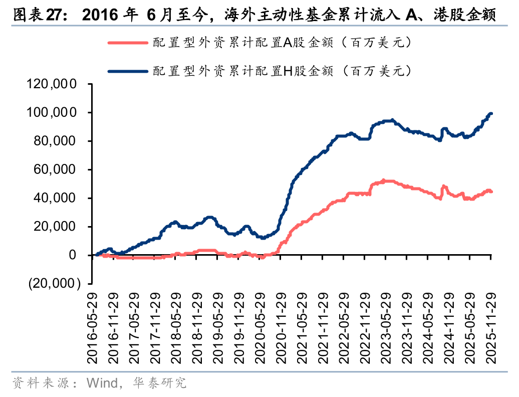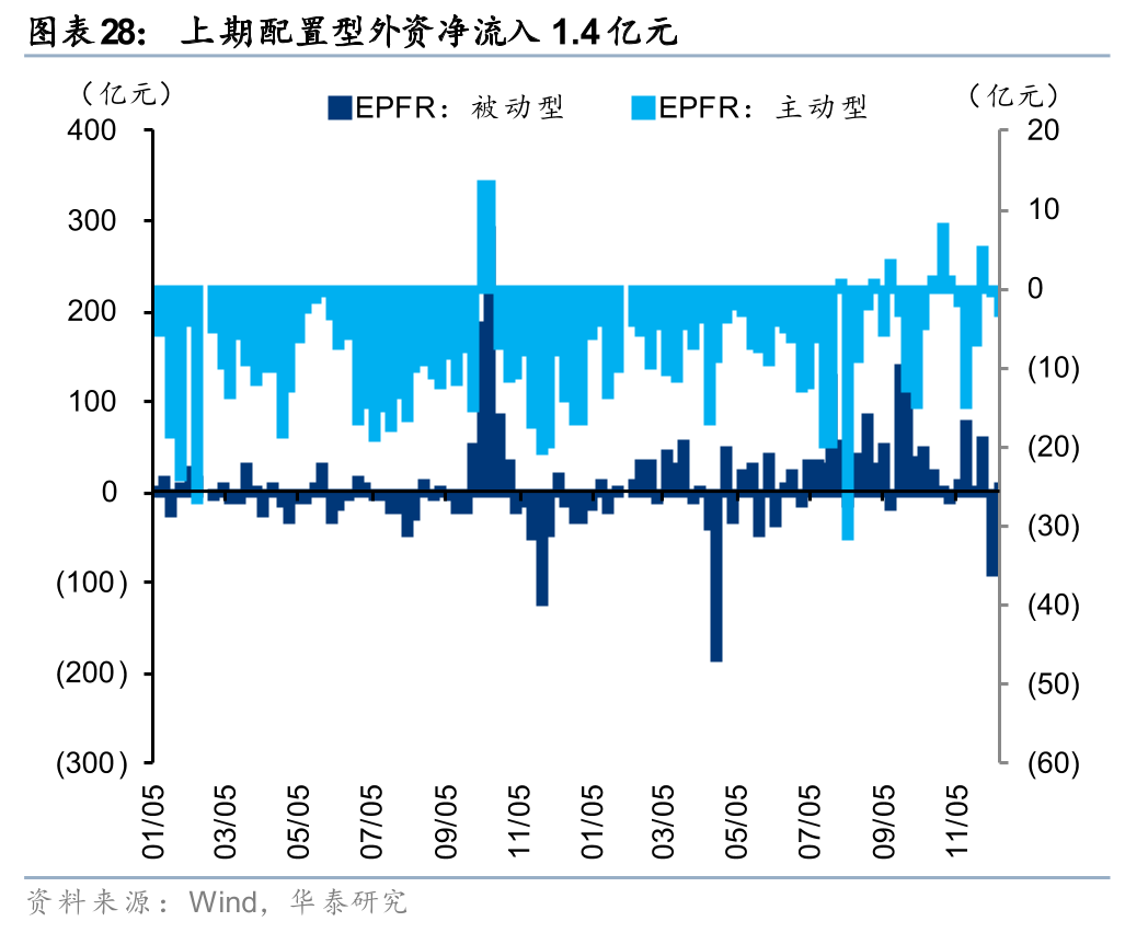 外资:以EPFR统计的外资中,12月5日-12月11日,配置型外资净流入1.4亿元,其中主动配置型外资持续流出3.2亿元,被动配置型外资净流入4.6亿元;