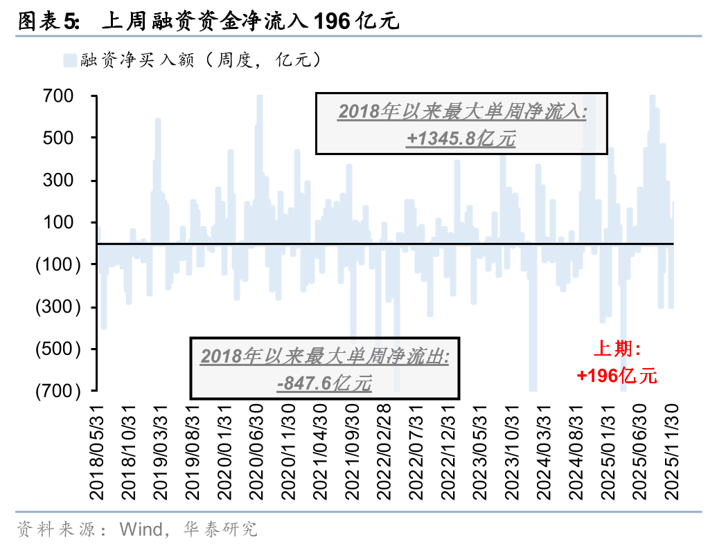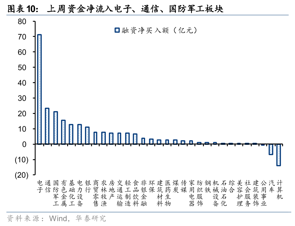 杠杆资金:上周融资资金流入196亿元,活跃度为10.2%,结构上,融资资金流入电子、通信、军工等板块,净流出计算机、汽车等板块;