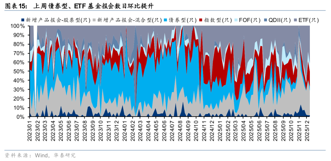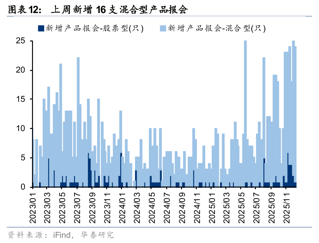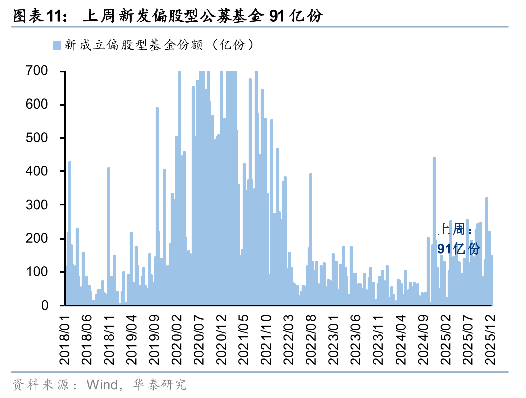 上周新成立偏股型基金91亿份,新发强度环比小幅回落,存量基金中,股票/混合基金权益仓位环比小幅回升。