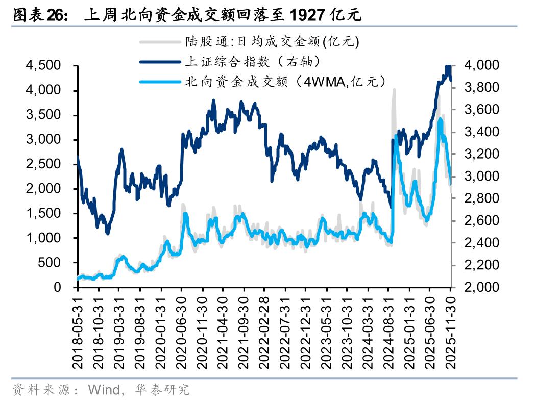 上周北向资金日均交易额回落至1927亿元。以EPFR统计的配置型外资中,12月5日-12月11日,配置型外资净流入1.4亿元,其中主动配置型外资持续流出3.2亿元,被动配置型外资净流入4.6亿元。