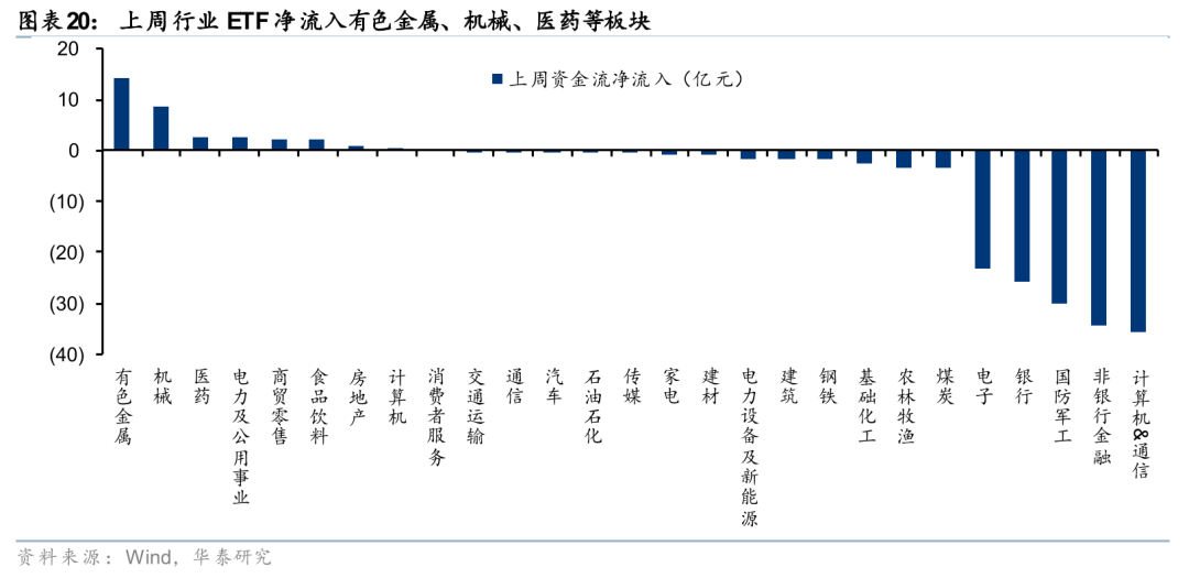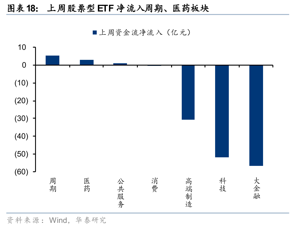上周股票型ETF净申购278亿份,净流出24亿元,其中宽基ETF净流入83亿元,已连续净流入两周。分板块来看,周期、医药板块净流入规模居前,行业中有色金属、机械、医药、电力及公用事业等行业净流入居前。