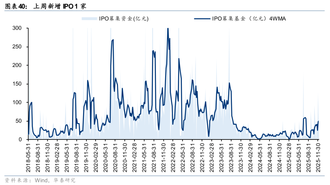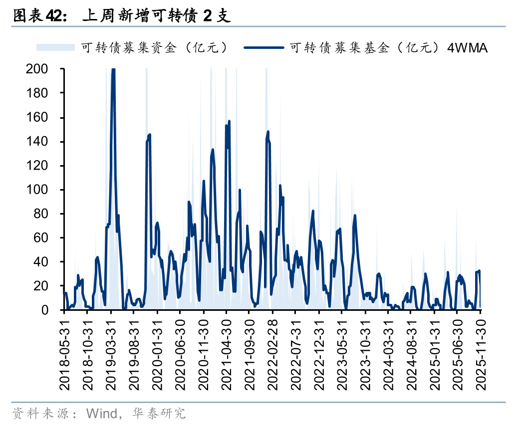 上周一级市场募资金额环比回落。上周新增IPO 1家,首发募集资金12.7亿元;上周新增定增4支,募资13.4亿元,新增可转债2支,募资15.6亿元。