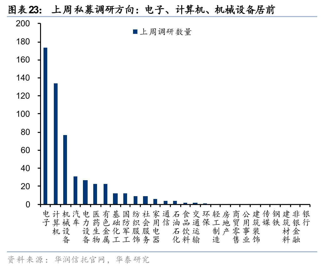 私募:上周,私募证券备案数量342支,备案数量环比回升且创下年内新高;调研方面,上周电子、计算机、机械设备等板块私募调研数目居前。
