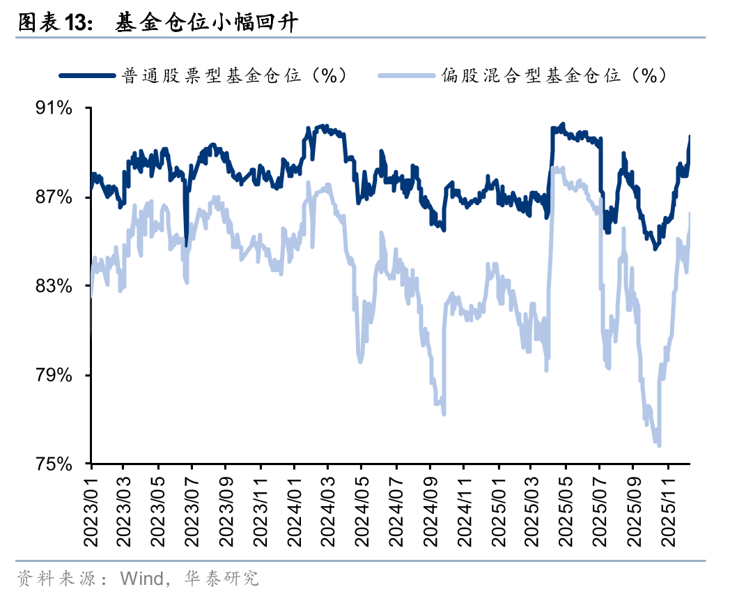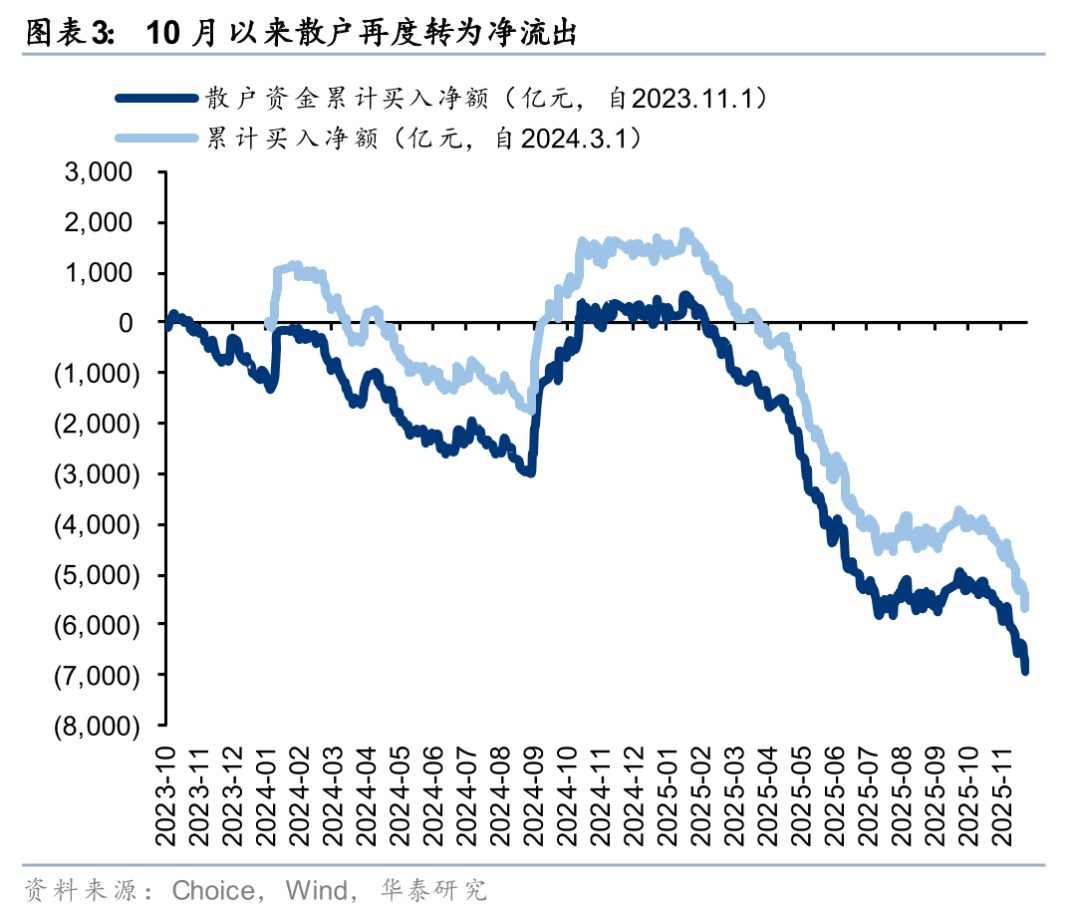 散户资金上周净流出463亿元。①数量角度,11月新增开户数238万户,环比2025年10月有所回升;②流量角度,2025年8月中旬以来,散户资金净流入;③方向角度,上周散户资金净流入通信、电子、非银金融等行业,净流出基础化工、医药生物、机械设备等方向。