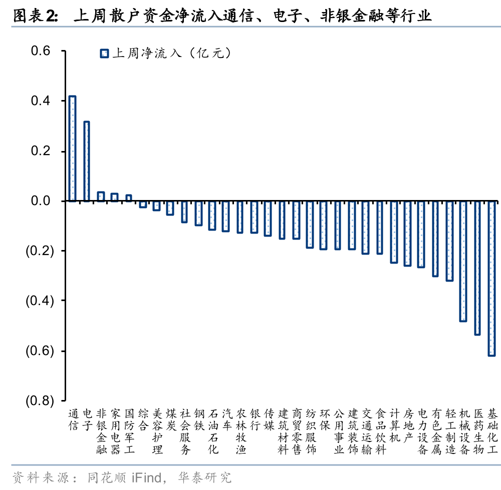 散户资金:上周散户资金(以小单交易金额刻画,后同)净流出463亿元,净流入通信、电子、非银金融等行业,净流出化工、医药、机械设备等方向;